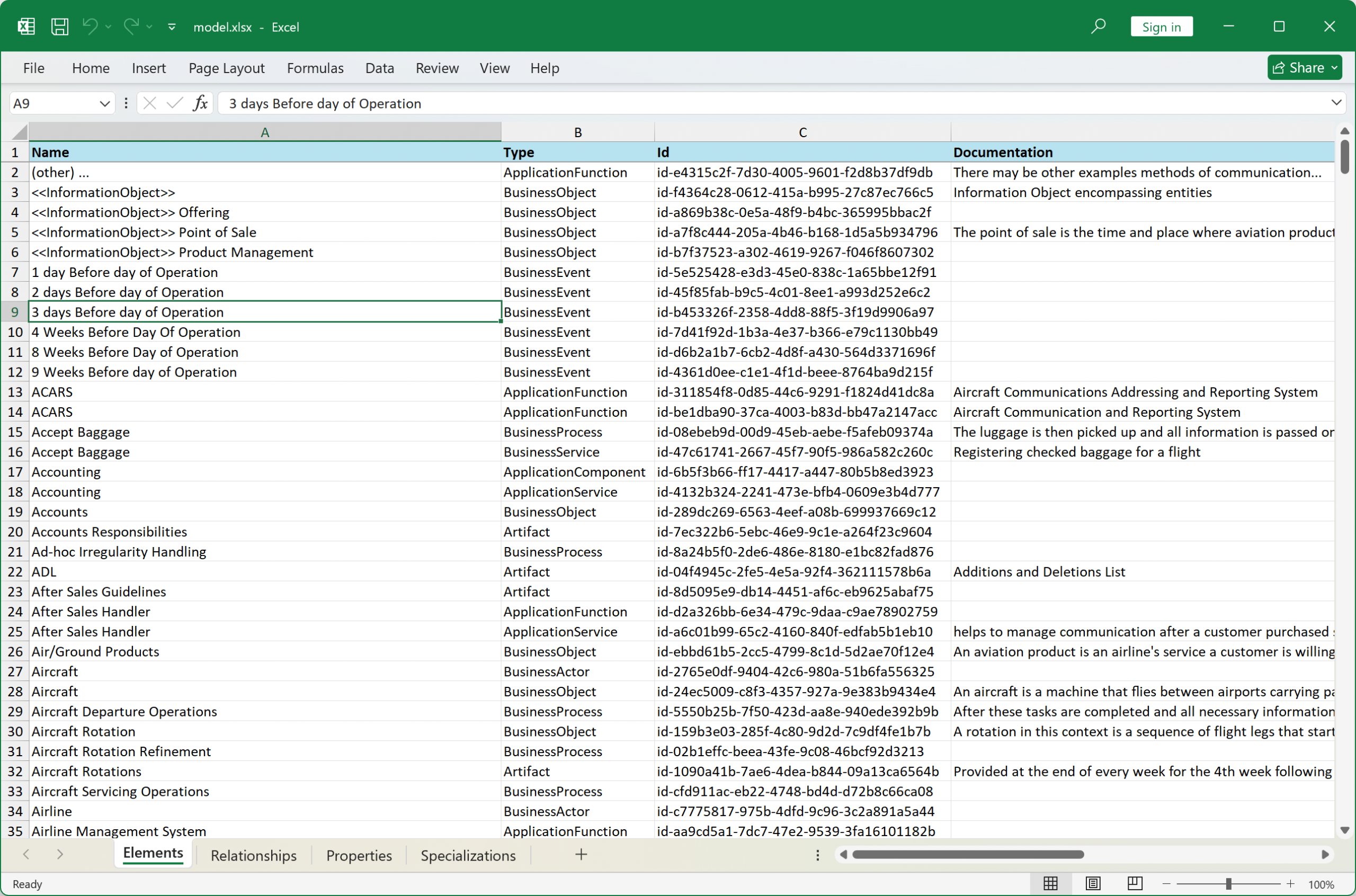 - Direct export of all ArchiMate model elements, relationships, properties and specializations to native Microsoft *.xlsx file format – each has its own sheet